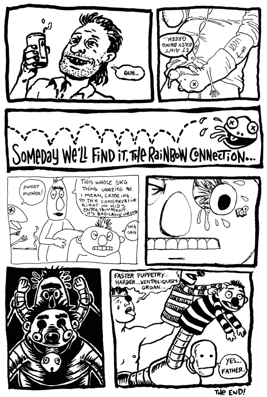 "Dark Muppetry" - 1999 - Alex Cuervo (panel 3), Ean Shuessler (panel 4), Todd Ramsell (panels 1, 7), David Wallin (panels 2, 6), unknown (5) ![]() Back to Comix Orgy All work on this site copyright the respective artist |