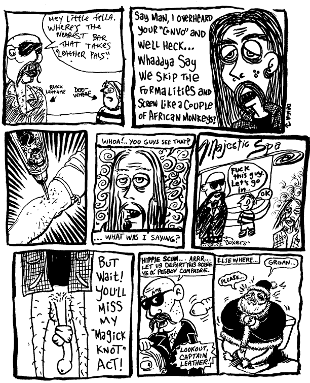 "Leather Pals" - 1999 - Carolyn Hestand (panel 5), John Freeman (panel 1), Alex Cuervo (panels 2, 6), Todd Ramsell (panels 4, 8), David Wallin (panel 3, 7) ![]() Back to Comix Orgy All work on this site copyright the respective artist |