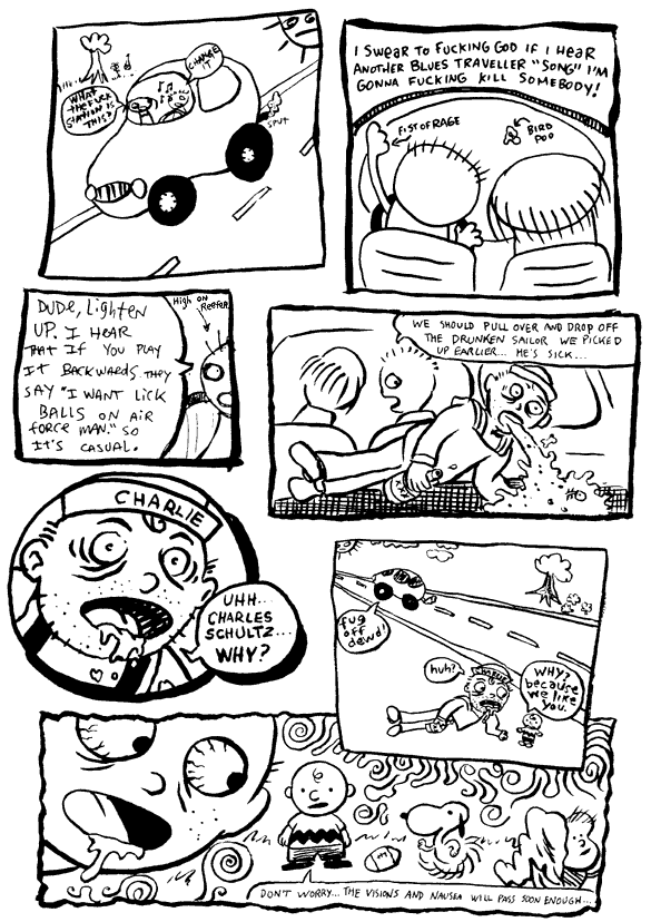 "Road Trip Charlie" - 1999 - Carolyn Hestand (panels 1, 6), John Freeman (panel 3), Alex Cuervo (panel 2), Todd Ramsell (panels 4, 7), David Wallin (panel 5) ![]() Back to Comix Orgy All work on this site copyright the respective artist |