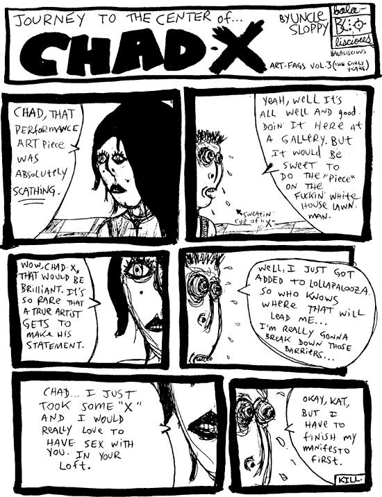 "The Art Fags - 3 - Chad-X" © John Freeman ![]() Back to Uncle Sloppy's Pleasure Circus |